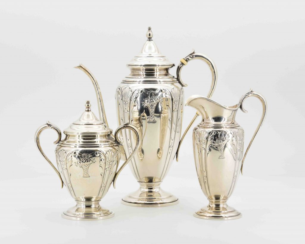 Kannen & Gefäße: Kaffeekannen, Milchkrüge (800, 900). [Bild: Silber-Kanne]